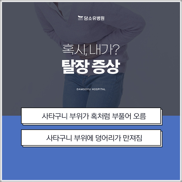 만약 혹을 만지면 증상으로는 서혜부에 혹이 튀어나온 것이나 무언가를 만지거나 합니다 솟아오른 부위를 만지면 물렁물렁하고 손으로 만져도 통증이 없는 경우가 많습니다. 또한 배에 힘을 주면 부풀어 있는 부분이 딱딱하고 분명하며 누워 있거나 힘을 빼면 튀어나온 부분이 없어지는 증상이 나타납니다. 해당 부위는 시간이 지남에 따라 점차 커질 수 있으며, 장기가 구멍에 끼어 혈액순환이 되지 않으면 통증과 함께 속이 메스꺼워지고 구토증상을 유발하는데, 심한 증상의 경우 소장이 들어가 갇히면 피가 제대로 통하지 않으며 이로 인해 장이 썩는 현상이 나타날 수 있습니다. 장이 썩으면 장 절제 수술을 해야 할지도 모르기 때문에, 그 전에 탈장 수술을 병원에 내원하여 빨리 진료를 받는 것이 바람직합니다.