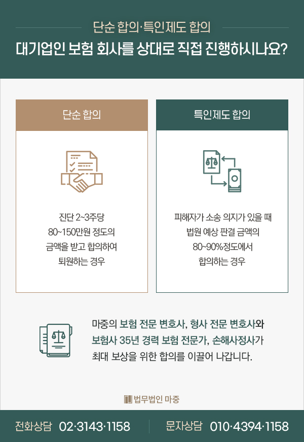 그러면 최적의 보험금을 받으려면 소송만이 정답일까요? 아닙니다. 보험회사와의 합의 방법은 크게 단순 합의와 특인 합의가 있습니다.단순합의란 진단 2~3주당 ᅥᆼᄋ 정도의 금액을 받고 합의하여 퇴원하는 경우로서 보험회사가 규정한 보상지침에 그대로 따르는 경우로서 경미한 사고시 많이 진행하는 합의입니다. 일을 오래 비워 둘 수 없으면, 빨리 합의하고 업무에 복귀하는 편이 좋을지도 모르는 경우에, 많은 교통 사고 보험에 합의하는 방법입니다.