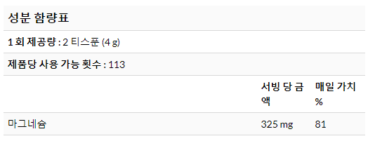 이 제품의 성분 함량표는 보지 못했지만 자세히 보면 두 숟가락(4g)을 먹어야 325mg의 마그네슘을 섭취할 수 있겠네요.제가 위에 300 밀리그램 전후로 섭취하고 있었다고 했습니다만, 좀 더 과감하게 증량해서 먹어 주시면 좀 더 몸 관리를 할 수 있을 것 같습니다.