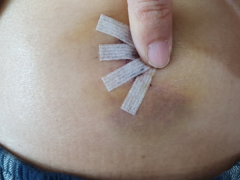 배꼽쪽에 난 상처. 작은 손가락으로 구멍을 막고 찍었어요. 어른들은 이만한 흔적이 남네요.