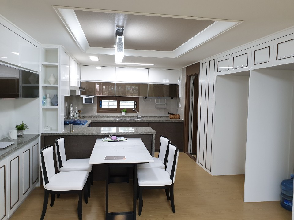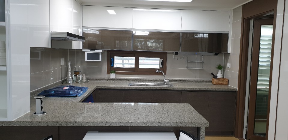 깔끔한 느낌을 주기 위해 3가지 색 연출을 하여 편안하고 아늑하며 통기성이 좋은 창문이 있어 환기와 채광 문제까지 해결하면서 적당한 크기로 싱크대 상부 공간을 최대한 넣을 수 있고 웬만한 것까지 다 보이지 않게 정리할 수 있다면 대리석 색이 짙기 때문에 음식 오염 걱정 없겠죠?