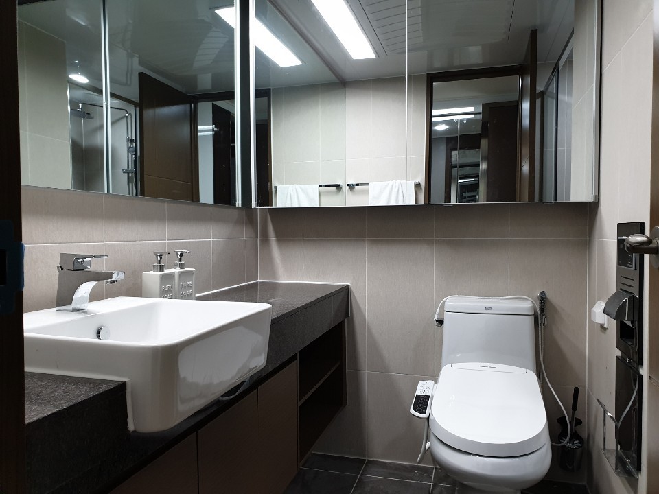 욕실을 보면 비데가 설치된 변기와 청소를 위한 전용 스프레이 건이 있어 깨끗한 상태를 유지할 수 있습니다.이미 완공되어 입주를 시작한 포항초곡화산샬레아파트