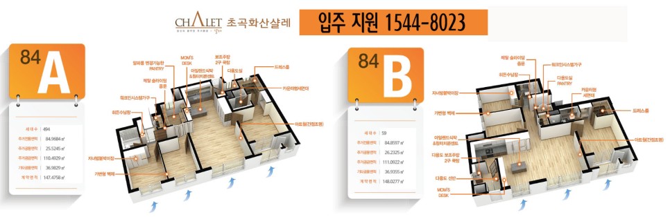 단일형에 84A, 84B 2가지 타입은 구조와 동선에서 차이가 나지만 대기전력 차단장치와 일반 형광등에 비해 전력 소모가 적고 내구성이 뛰어난 LED 조명과 각 세대별 에너지 사용량을 실시간으로 조회할 수 있어 여름과 겨울에 유용한 기능입니다.