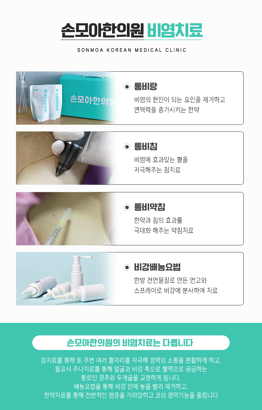 이러한 증상이 나타나면 한의학적 접근으로 단순히 발생한 증상을 억제하는 것 뿐만 아니라 전체적으로 망가진 균형과 신체 면역체계를 점검하고 올바르게 대처할 수 있도록 함으로써 전반적으로 호흡기 건강을 튼튼히 하는 것이 필요했습니다. 대구축농증배농요법은 한약을 끓여 만든 약물을 콧속 점막에 직접 도포하여 흡수시켜 콧속에 고름을 배출하는 치료였습니다. 한약을 면봉에 묻혀 콧속에 삽입하면 한약이 코점막에 스며들게 되어 비강 내와 부비강 내에 쌓여 있는 염증을 밖으로 배출시켜 염증을 근본적으로 치료하여 코의 답답함, 안면통, 두통, 피로감 등을 해소할 수 있었습니다.