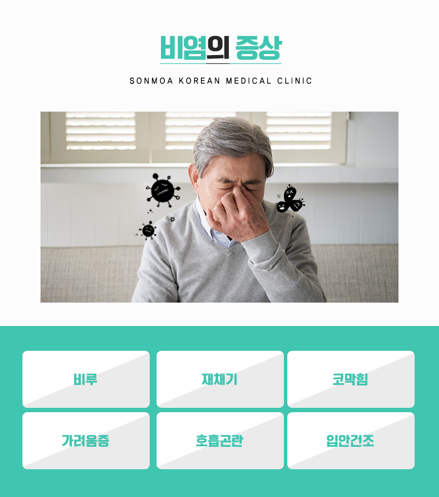 비염은 유전적인 원인도 있지만 주변환경에서 코의 점막을 자극하는 원인이 있는 경우 생활습관에 문제가 있을 수 있습니다. 감기에 걸렸을 때 코의 증상이 먼저 일어나면 코 점막이 선천적으로 약한 경우라고 생각했습니다. 알레르기성이나 만성의 경우 대부분의 외부에서 발생하는 자극요인에 대해 우리 몸이 지나치게 민감한 반응을 보임으로써 나타나는 증상이기 때문에 우리 몸의 면역 체계가 불안한 상황에서 잘 나타날 수 있었습니다. 특히 호흡기의 면역력이 저하되어 크지 않은 자극에 의해서도 코점막이 민감하게 반응하여 재채기, 콧물, 코막힘 등의 증상을 유발하게 됩니다.