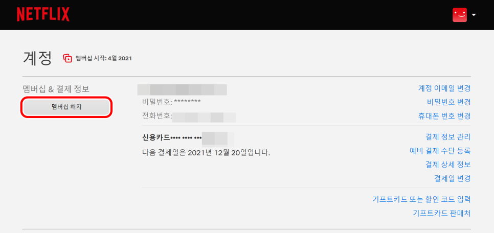 계정란에 들어가면 멘버십&결제 정보 등이 나옵니다. 아래쪽으로 내려가시면 멤버쉽 해지 버튼을 찾을 수 있습니다.