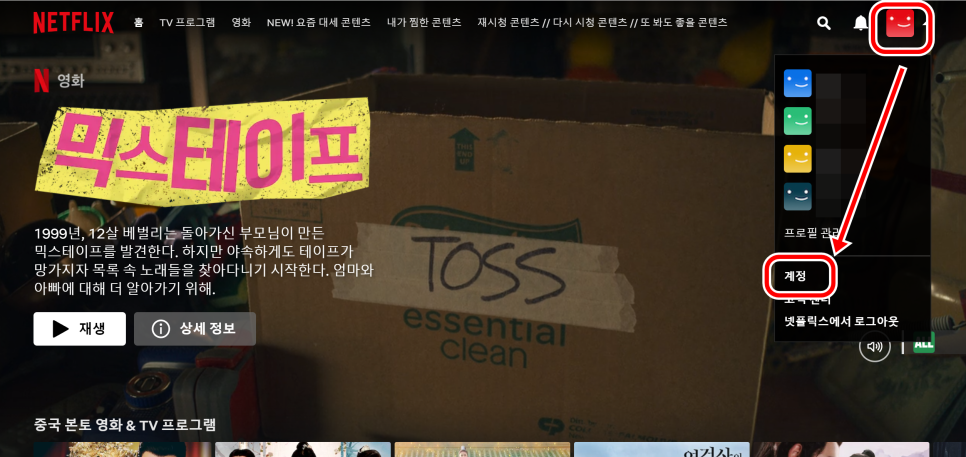 넷플릭스 사이트 또는 앱에 접속하셔서 첫 화면에서 우측 상단에 보시면 프로필 이미지가 있습니다. 프로필을 클릭하시고 ‘계정’을 눌러주세요.