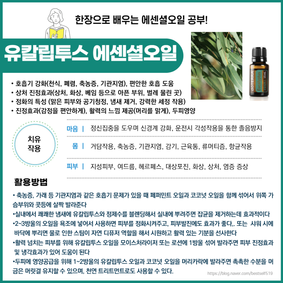 - 4. 유ー카리프타스오일 활용 방법, 축농증, 가래 등 기관지 염 같은 호흡기 문제가 있을 때는 페퍼민트 오일과 코코넛 오일을 섞고 가슴 부위와 콧등에 살짝 발라라. 실내에서 크에크에하의 냄새에 유카리와 정제 물을 블렌딩 하고 실내에 뿌리면 잡균을 제거하는 데 효과적이다. 2~3방울의 오일을 욕조에 넣어 사용하면 피부를 정화시키고 주고 피부 발진도 효과가 좋고. 또는 샤워시 바닥에 뿌리면 물에 의한 팀이 자연 디퓨저의 역할을 하는 시원하고 활력 있는 기분을 선물한다., 활력 넘치는 피부에 유ー카리프타스오일을 모이스처라이저 또는 로션에 1방울 섞어서 바르면 피부 진정 효과 및 냉각 효과가 있어 도움이 된다. 두피에 영양 공급을 위해서 1~2방울의 유칼립투스 오일과 코코넛 오일을머리에 바르고 오면 촉촉한 수분을 머금은 머리를 유지할 수 있고 천연 트리트먼트로도 사용할 수 있다.