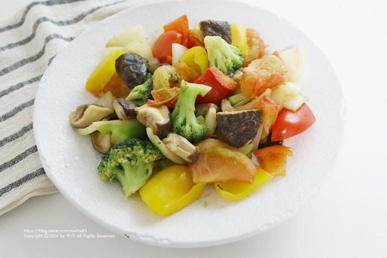 제가 저녁에 주로 해먹는 야채볶음이에요.토마토가 기본이고 브로콜리, 파프리카, 마늘, 버섯, 양배추 등을 넣어 볶아서 먹었는데 이번 갑상선암 예방법에 대해 알아보고, 제가 먹고 있는 음식과 비슷해서 이렇게 먹으면 갑상선암 예방도 된다고 생각하기 때문에 좋습니다.
