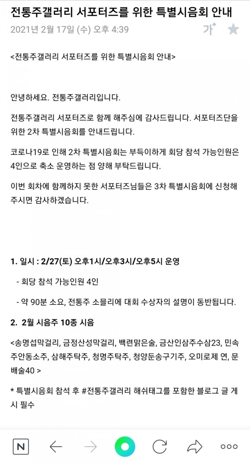 10월에 다녀온 전통주 갤러리.작년에는 일반 참관객으로 방문하였으나 2020년 우수 콘텐츠로 선정되어 전통주 갤러리 서포터즈에 참가하게 되어 특별 전시회에 초대되어 방문하였습니다.일반 상설전시회는 5가지 전통주인데 특별전시회는 10가지+a라고 하니 더욱 의미있는 시간이 될 것 같습니다. 50m 네이버 더보기 / 오픈스트리트맵지도데이터x 네이버 / 오픈스트리트맵지도컨트롤러 범례부동산대로읍,면,동시,군,구시,도국저도 기념샷을…와인은 전부 서양 것이 아니었구나.(사실 알코올 때문일지도 모른다)무료 시음회도 굉장히 인기가 많은데 내부 분위기가 너무 좋아서 데이트 코스로도 많이 오십니다.술을 만드는 방법, 역사적 지식 외에도 다양한 전통주 판매도 의의가 있지만 포토존도 나름대로 예뻐져서 인생샷을 남겨가는 것도 좋을 것 같습니다.또한 시음 노트와 펜도 제공됩니다.내부 분위기는 대체로 이렇습니다.다양한 전통주도 맛볼 수 있었고 술에 대한 지식도 더 알 수 있었던 유익한 시간이 아니었나 싶습니다.들어오면 가장 먼저 보이는 것이 전통주의 사계절이라는 점입니다. 우리도 복날 삼계탕을 먹거나 설날에 팥밥을 먹듯이 전통주도 계절별로 마시는 데 의미가 다양하다고 합니다.1. 송명섭 막걸리 / 6도 / 탁주 우선의 첫 술인 ‘송명섭 막걸리’는 자신의 이름을 막걸리 이름에 넣을 정도로 자신 있는 전통주라고 할 수 있습니다.개인적으로 마셨을 때의 첫 느낌은 정말 ‘깔끔하다’라는 생각이 들었어요.내부에 별도의 포토존도 구비되어 있습니다.옆에 전통주 갤러리 플래카드도 있고 전통 탈, 삿갓, 부채, 곰방대 등 전통 컨셉에 맞는 소품도 풍부합니다.특히 설명해주시는 분들이 각종 식품명인분들의 에피소드까지 실감나게 설명해주시니.. 시간 가는 줄 모르고 있었던 것 같습니다.특별시음회는 약 1시간 30분 전, 나중에 진행될 예정이라고 합니다.시간만 보면 너무 길어 보이는데 사회자분 설명을 주의 깊게 들으면서 시음하다 보면 시간이 금방 갑니다.입구에 들어가시면 매월 정해진 주제에 따라 맛볼 수 있는 전통주 5종이 전시되어 있습니다.이미 오신 분들도 한 달 뒤에 다시 오시면 또 다른 술이 기다리고 계실 거예요.몇 번 오면 소소한 사은품도 준다니 꾸준히 출석체크 해볼만해요.일행과 함께 둘러보는 동안 직원분들은 시음회 준비 중인지 바쁘실 것 같아요.원래 화살표에 있는 저 발판 스티커에 각각 1명씩 선 상태에서 시음을 하는데 아무래도 시국이 시국이라 내부에서 투명 칸막이를 두고 진행한다고 합니다.그 다음은 얼핏 봐도 100가지 이상이 훨씬 넘어 보이는 전통주의의 향연…(상상 이상으로 종류가 다양)3. 백련 맑은 술 / 12도 / 약주 누룩으로 빚은 술로 정월 대보름에 마시는 술의 종류 중 하나입니다.마시면서 한 해 좋은 일이 있거나 좋은 일로 마무리하는 등 희망하는 것을 빌면서 마시는 술이라고 합니다.강남전통주갤러리 상설시음회, 10월 첫째주 후기 강남전통주갤러리 상설시음회, 10월 첫째주 후기 이제 마스크를 쓰고 나가는 게 일상이고 사람들이 많이 모인 곳… blog.naver.com4. 청양둔송구기주/ 16도 / 약주 구기자를 넣어 만든 술로 약주보다는 약간 와인, 과실주 느낌에 가깝습니다.달콤하고 균형감이 잘 잡혀 있어서 좋은 술이었던 것 같아요.6. 금산삼주 수삼 23 / 23도 / 일반 증류주를 마시고 바로 느낀 것이 인삼향기가 확 올라온 것 같습니다.안에 인삼이 들어있기도 했지만 술 자체에도 인삼을 발효시키고 있기 때문에 입안을 헹궈도 인삼의 느낌이 컸습니다.정말 여운이 오래 남은 술이었어요.전통주갤러리 연락처 02-555-2283 전통주갤러리 위치 서울 강남구 테헤란로5길 51-20 전통주갤러리 오픈시간 10:00 – 20:00 (월요일 휴무)전통주갤러리 서울특별시 강남구 테헤란로5길 51-20 예약