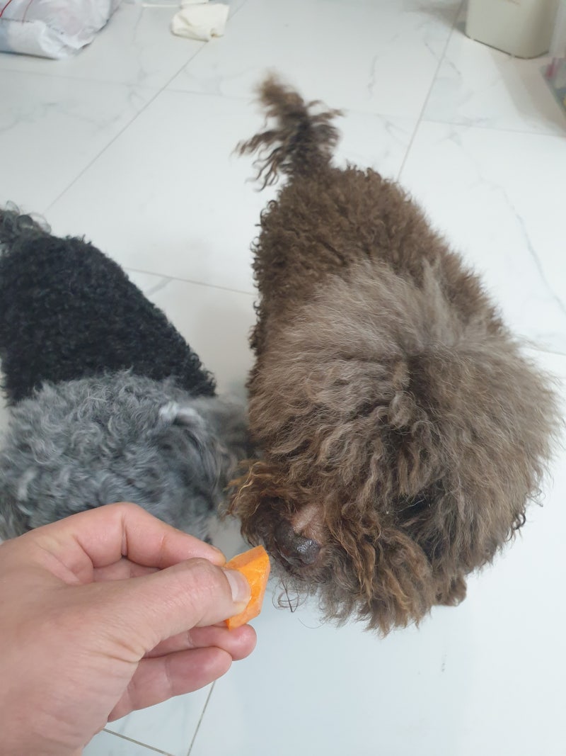 강삼에 삶은 당근을 준비했더니 단맛에 아주 맛있게 당근 먹방을 보여줬어요. 강아지에게 좋은 음식은 적정량 기준을 충족했을 때 영양학적 가치를 발휘합니다. 주의사항만 잘 지켜주면 당근이 강아지에게 좋은 간식이 될 수 있습니다. ^^