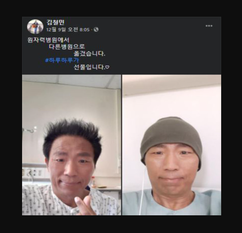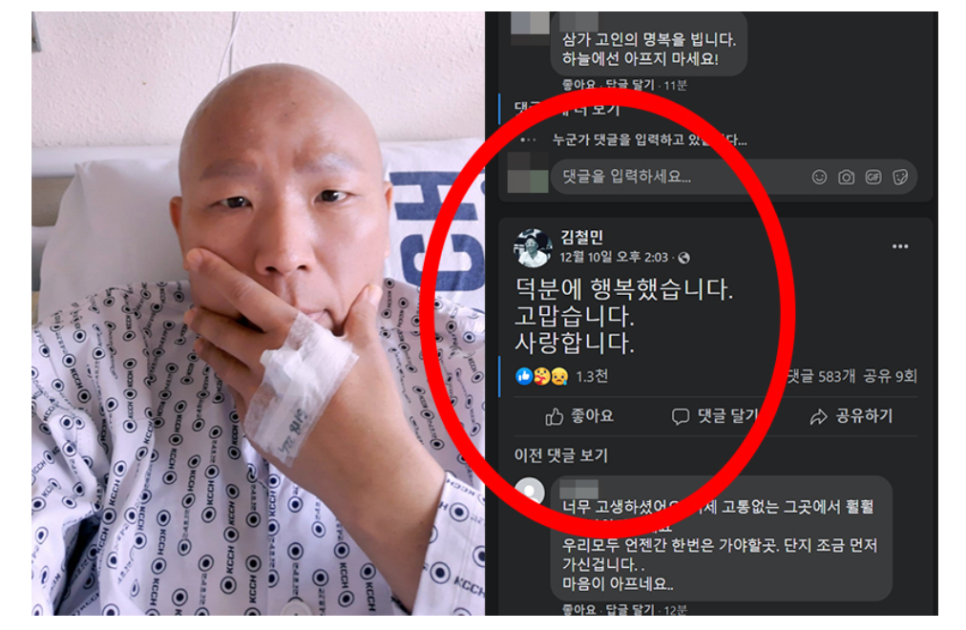 6일 전, 10일 페이스북에 올라온 김철민 씨의 짧은 글’ 덕분에 행복했습니다. 감사합니다。사랑합니다라고 작별 인사를 남겼다.많은 분들이 그를 응원하고 완치는 어렵더라도 오랫동안 대중 곁에 남아 있기를 간절히 기도했고, 개그맨 김철민씨도 폐암 4기 진단을 받은 뒤 2년 넘게 투병하며 팬들에게 보답했다.