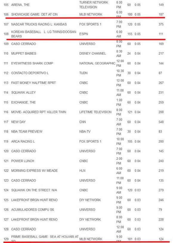 이날 MLB 네트워크 시청률은 0.03-0.05를 기록했습니다.특히 미국 동부시간으로 새벽 6시에 방송된 엘 두정이 저녁 9시에 방송된 시애틀-휴스턴 개막경기의 시청률을 웃돌았다니 대단하네요!!