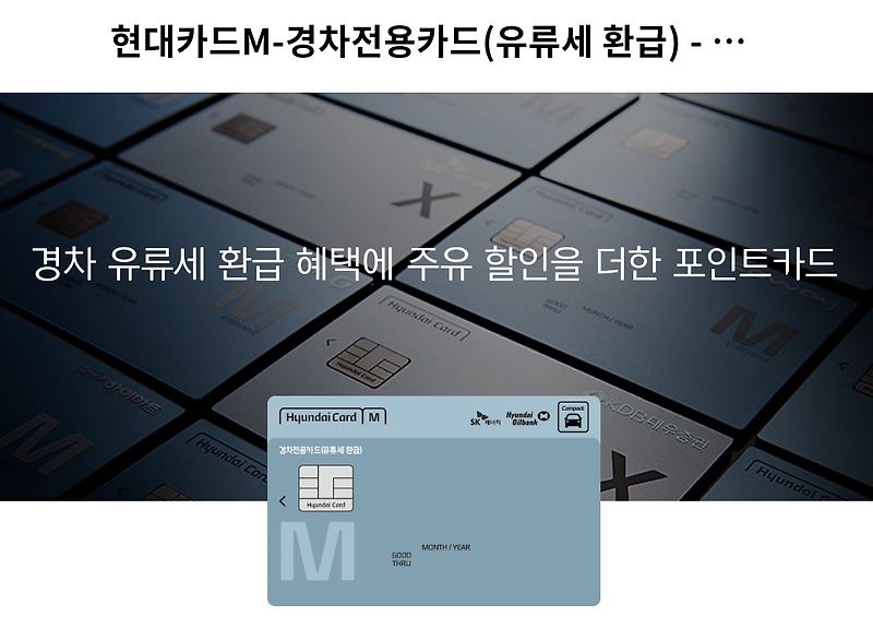 현대카드 M 경차 전용 카드를 발급받아 2개월간 70만원~30만원 미만 혜택을 받을 수 있는 현대오일뱅크, sk에너지주유소에서 주유할 경우 리터당 200원씩 할인받을 수 있다.70만원 이상 사용하면 리터당 400원 청구할인을 받을 수 있다
