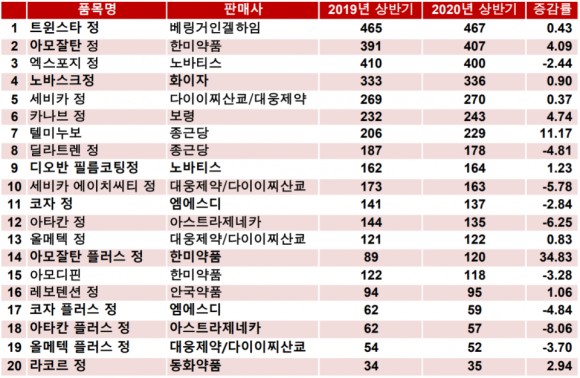 한편 한국의 2020년 상반기 고혈압 치료제 시장 브랜드 1위에 베링거인겔하임의 ARB/CCB 복합제 트윈스타전이 지난해 상반기에 이어 다시 한 번 이름을 올렸다. 고혈압 고지혈증 지질이상증을 노린 3제 복합제의 등장에도 의연하다.