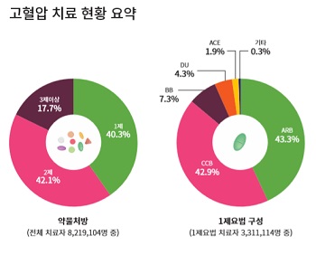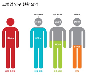 고혈압 치료를 위해 연 1회 이상 의료기관을 찾는 사람은 890만 명 정도였고 고혈압 치료제를 꾸준히 처방받고 있는 사람은 570만 명이었다. 또 고혈압 치료자 중 57%가 당뇨병 또는 지질이상증 치료를 동시에 받고 있는 것으로 나타났다.