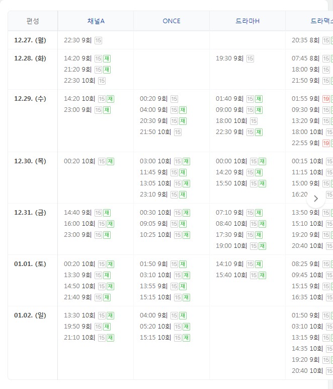 1월 2일까지의 재방송 및 편성표입니다.