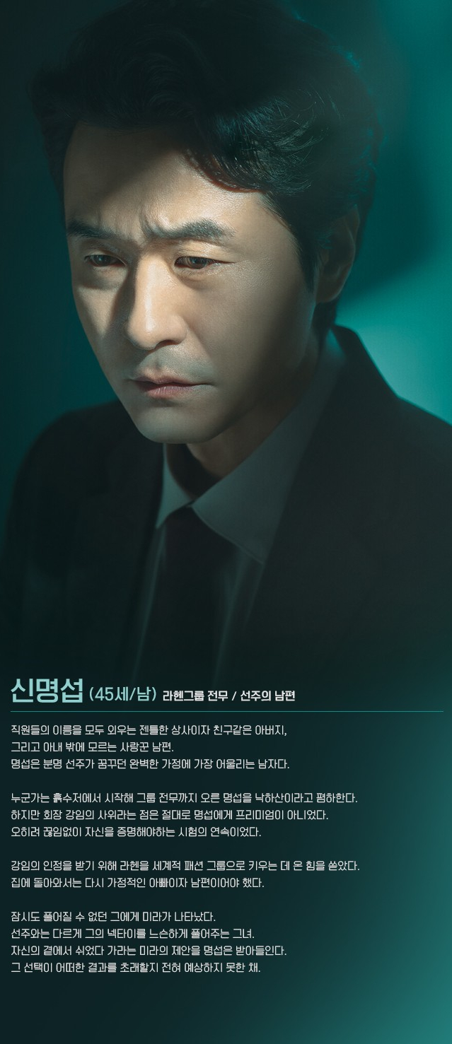 직원들의 이름을 다 기억하는 젠틀한 상사이자 친구 같은 아버지, 그리고 아내만 아는 애정 많은 남편. 명섭은 분명 선주가 꿈꾸던 완벽한 가정에 가장 어울리는 남자다.
