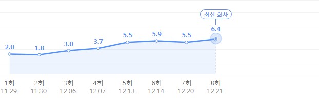 점점 시청률이 올라가고 있는 추세네요최고 시청률은 6.4%입니다.
