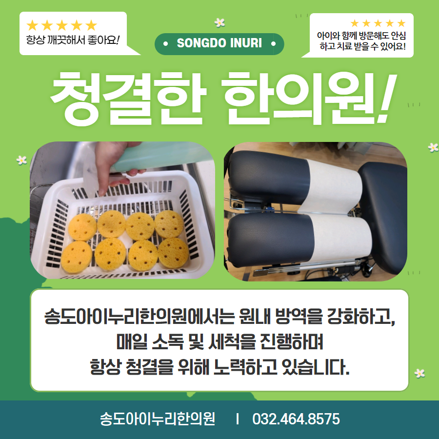 안녕하세요, 인천 송도 아이누리한의원입니다. 인천 송도 아이누리 한의원에서는 가족의 건강을 위해 엄선된 GAP 무농약 한약을 사용하여 안전과 건강을 위해 만전을 기하고 있습니다. 인천 송도 아이누리 하환 원장과 고재경 원장은 세 아이를 키우고 있는 아버지이자 어머니로 소아부터 어르신까지 시기별 맞춤 진찰과 치료를 시행하고 있습니다. 인천 송도 아이누리 한의원은 부모님의 마음으로 아이들과 부모님의 건강과 행복을 지켜드리는 가족 한의사입니다 혹시 아이가 감기약 달고 살거나 비염, 부비강염, 중이 m.booking.naver.com 인천광역시 연수구 송도국제대로 157