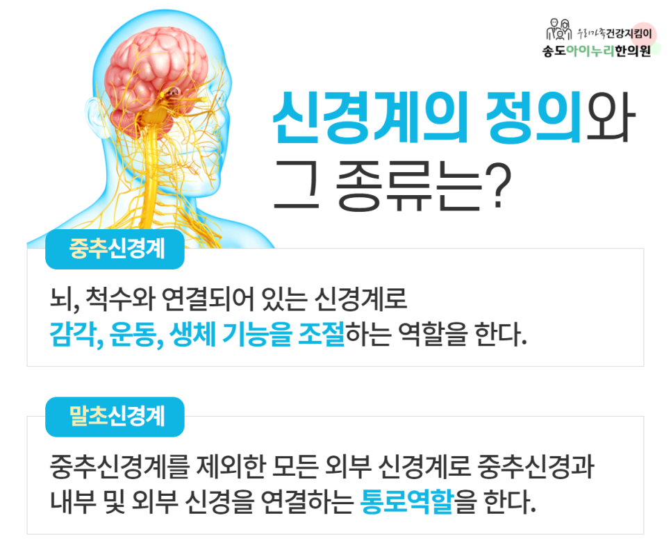 안녕하세요 송도 아이누리 한의원입니다오늘은 자율신경계의 이상질환에 대해 알고 싶은 분에게 신경계에 대해 간단히 정리하고 자율신경계에 이상이 생겼을 때 발생하는 신체 내 변화에 대해 알아보겠습니다.