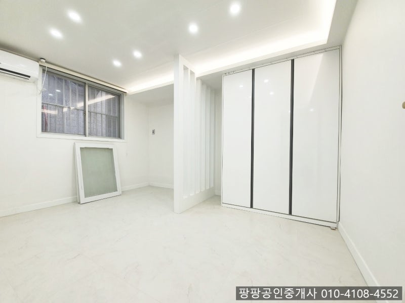침실입니다. 옷장이 설치되어 있으니 옷 수납 걱정 없이 들어오세요.주무시는 공간과 센스있는 가벽으로 공간분리 느낌으로 구분되어 있습니다.눈부심을 방지하기 위한 블라인드도 설치되어 있고 침대와 에어컨, TV까지 모두 옵션으로 추가되어 있기 때문에 몸만 들어오면 되는 매력적인 매물이 됩니다.