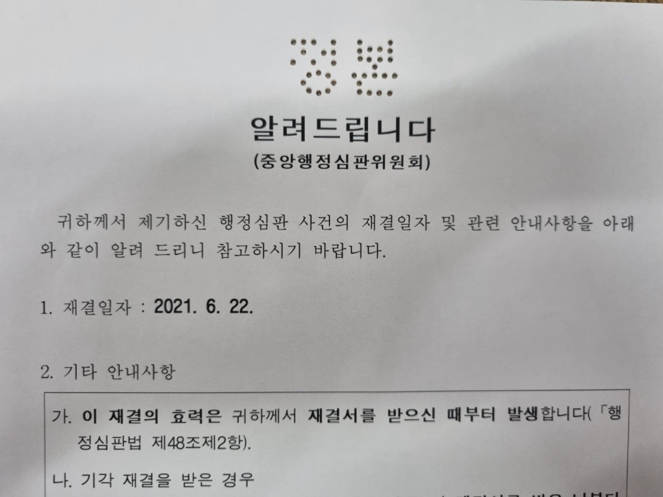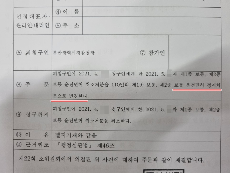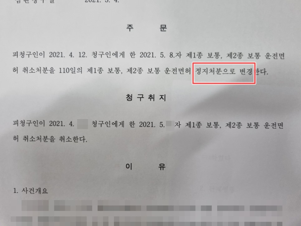 행정심판에서 정지로 변경된 재결서 일부 2021.0622