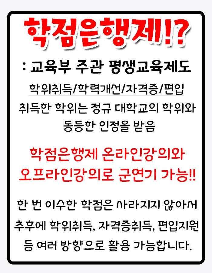 학점은행제를 활용하는 분들은 고등학교 졸업자분들이 입시 준비를 위해 활용하거나 자격증 취득을 위한 시험 조건을 충족시키기 위해 준비를 하기도 합니다.여기서 이분들의 공통점은 뭘까요?학위를 취득하는 목적입니다.여러분은 이 학위 취득을 목적으로 군대를 연기할 수 있습니다!그런데 이 학위 취득을 목적으로 군 연기를 진행한다고 해도 조건이 존재하는데 그러면 그 조건에 해당하는지 그리고 과정은 어떻게 진행되는지 같이 알아보겠습니다!