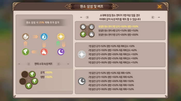 대표적으로 하나의 속성만으로 구성했을 때는 기존 공격력 대비 무려 200% 상승하는 것을 알 수 있듯이 강력한 화력을 자랑하지만 상대편에 동성 속성이 있으면 오히려 실패할 수 있는 구성이다. 때문에 적절히 두 속성을 균등하게 분배해 균형을 유지하는 것이 유리하게 작용한다.