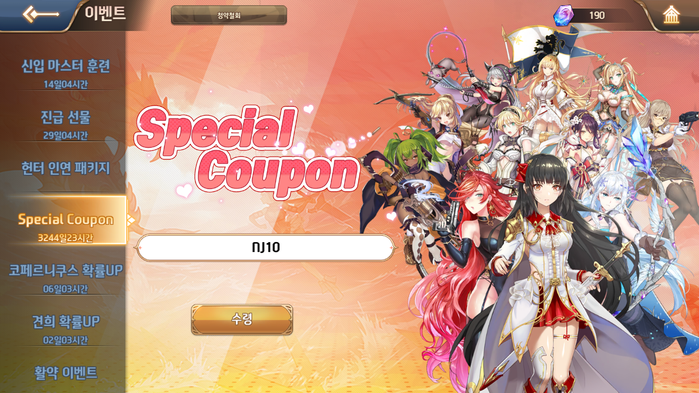 이번 쿠폰은 기존 쿠폰번호 입력창이 아닌 메인 화면에서 이벤트 메뉴에 접근하면 발견할 수 있는 스페셜 쿠폰번호 입력 창에서 등록 가능하며 등록 직후 모집권 20개, 원소모집권 10개, 확률업모집권 10개까지 총 영웅모집권 40장을 누구나 받을 수 있다는 점이 포인트다.