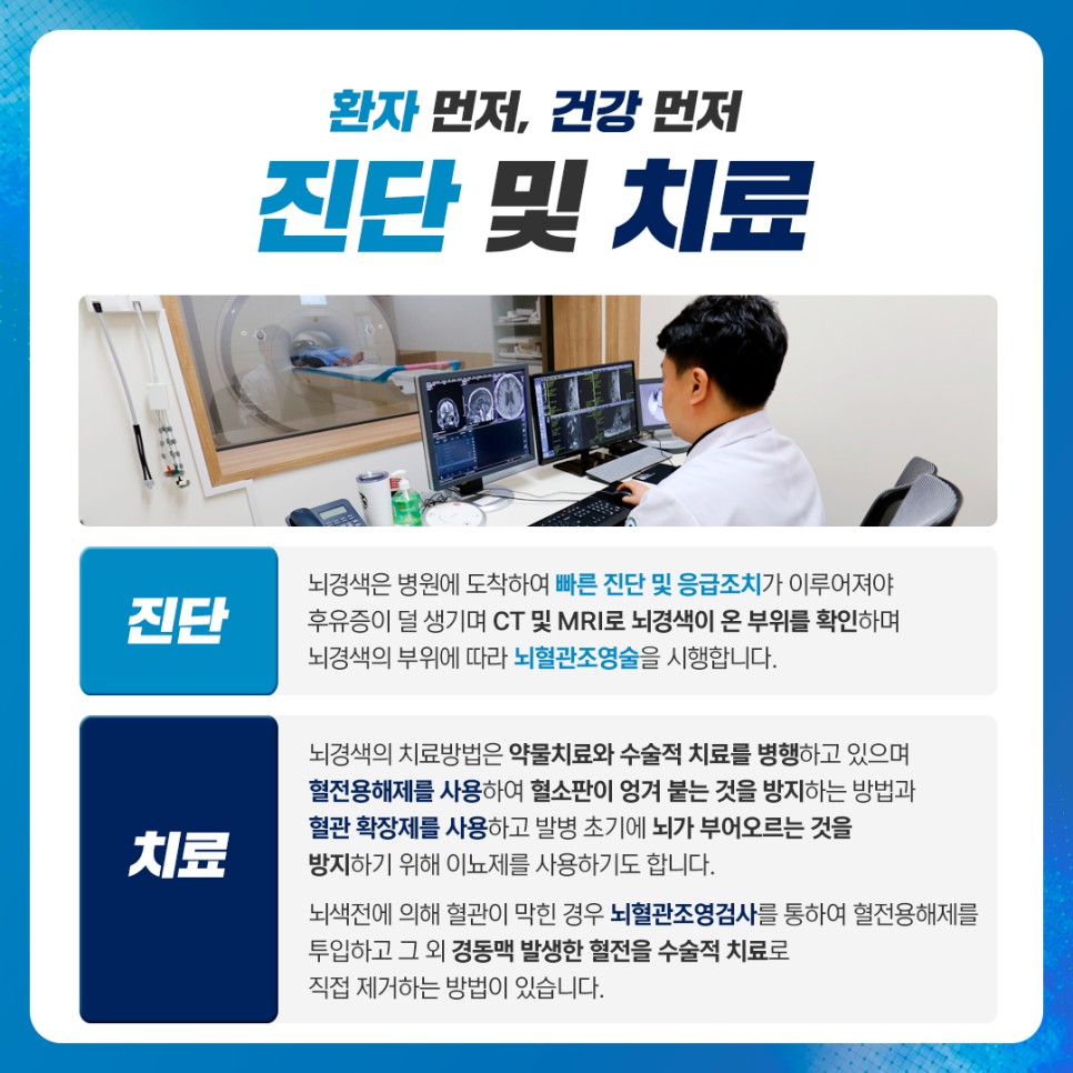 뇌경색은 병원에 도착하여 신속한 진단 및 응급처치가 이루어지면 후유증이 잘 남지 않으며 CT 및 MRI를 통하여 뇌경색을 전 부위에 확인할 수 있으며 뇌혈관 조영술을 시행합니다. 이후 심장의 병적인 증상으로 인해 발생하는 뇌경색을 조사하기 위해 심전도, 심장초음파 등을 실시하고 혈액검사를 통해 다양한 뇌졸중의 원인이 있는지 파악합니다. 뇌경색 치료는 약물치료와 수술적 치료를 병행하며 혈전용해제로 인해 혈소판이 엉키는 것을 방지하는 방법과 혈관확장제를 사용하여 발병 초기 뇌가 부어오르는 것을 방지하기 위해 이뇨제를 사용합니다. 뇌색전으로 인하여 혈관이 막힌 경우 뇌혈관조영검사를 통하여 혈전용해제를 투입하고 기타 경동맥이 발생한 혈전을 수술적 치료로 직접 제거하는 방법이 있습니다.