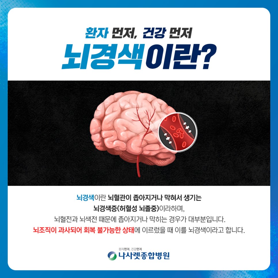 뇌졸중은 매우 긴급한 질환으로 뇌에 혈류 공급이 끊기면 짧은 시간 안에 뇌세포는 죽어 돌이킬 수 없는 결과를 초래합니다. 뇌졸중은 뇌경색과 뇌출혈 두 가지로 나눌 수 있습니다. 오늘은 뇌경색에 대해 알아보겠습니다.