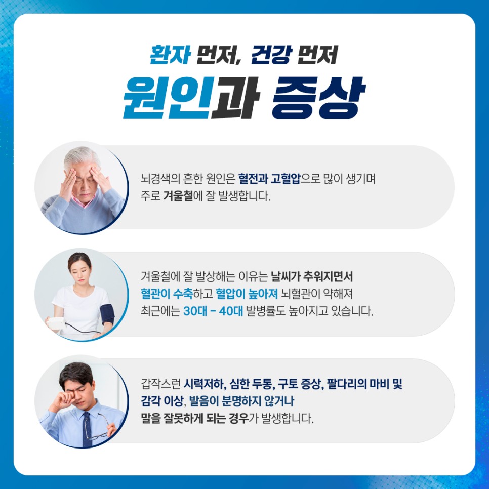 뇌경색은 날씨가 추워지면서 혈관이 수축되고 혈압이 높아지며 뇌혈관이 약해지므로 최근에는 겨울철에 발생할 확률이 높아지고 30~40대에 발생할 확률도 높아지는 추세입니다. 갑자기 안면마비, 시력저하, 심한 두통, 구토, 손발의 마비 및 감각 이상, 발음이 확실하지 않거나 말을 못하는 증상이 나타납니다.