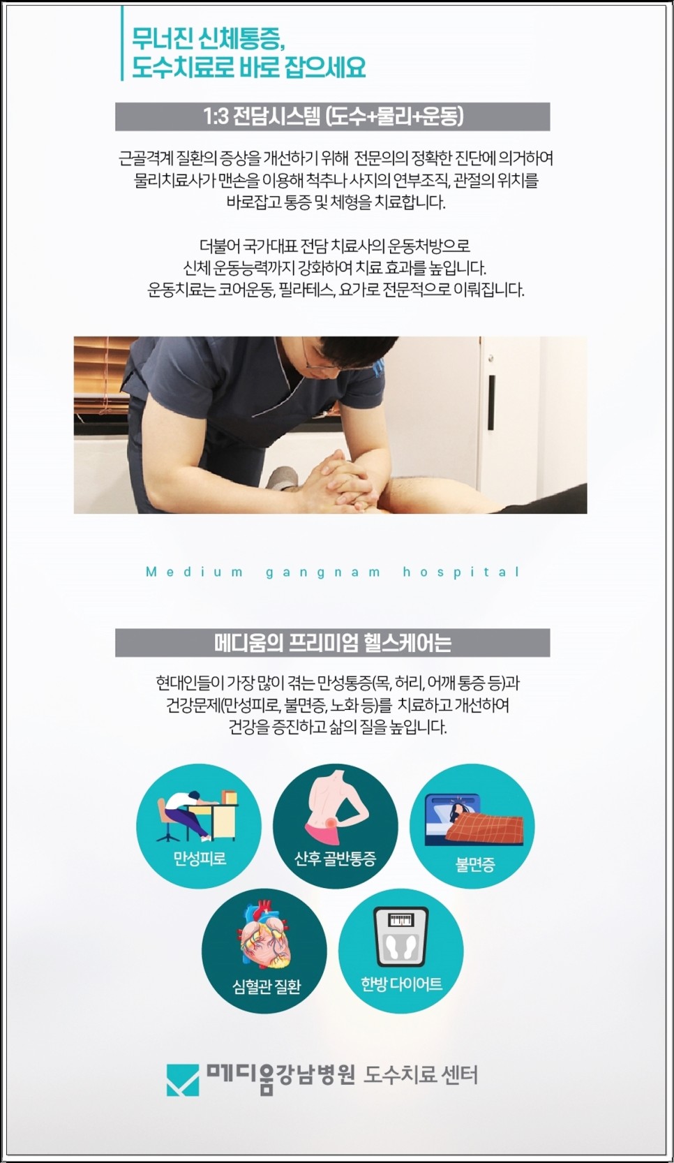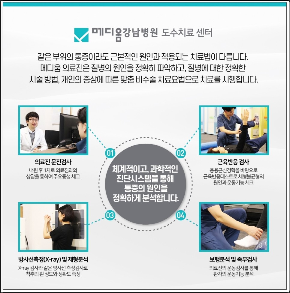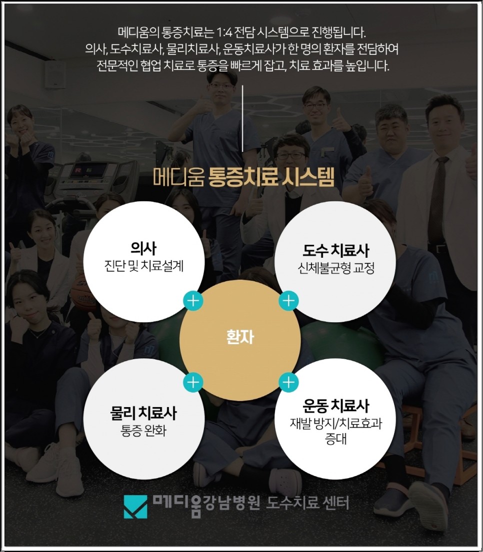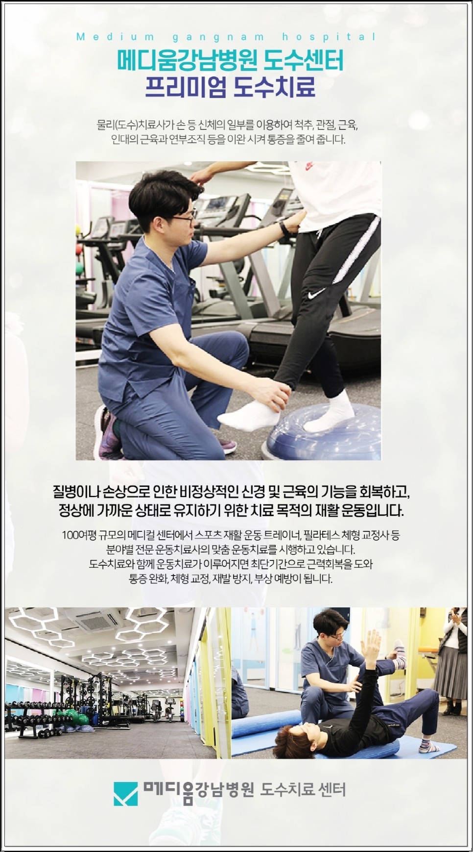 메디엄 강남도수치료센터는 국가대표와 프로선수들이 재활과 훈련을 많이 하는 곳으로 재활운동요법사를 보유하고 있습니다.