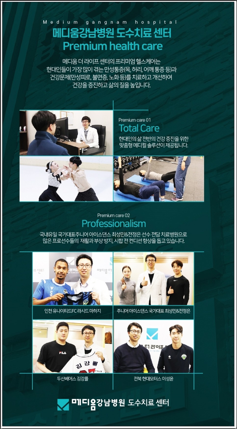 최근에는 인천 유나이티드 FC의 미하지 선수, 두산 베어스의 김강률 선수 등 많은 프로 선수들이 찾아다니며 관리를 받았습니다.