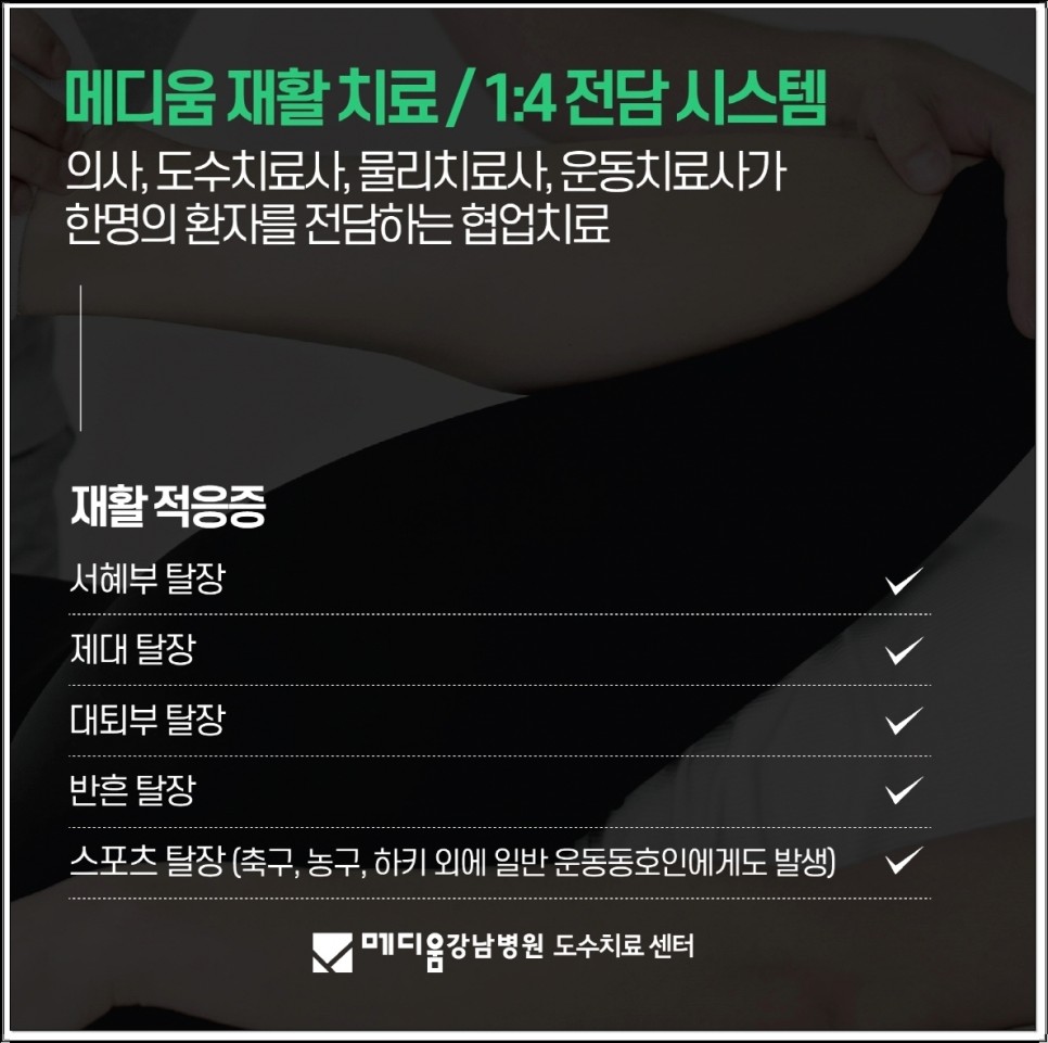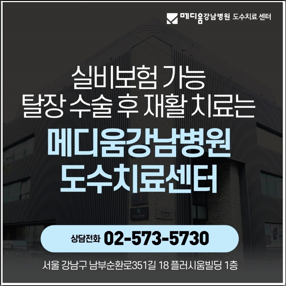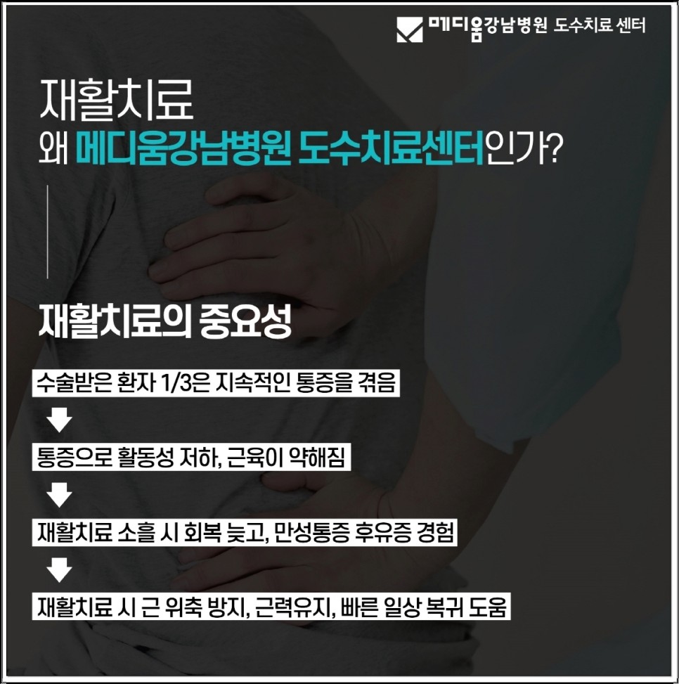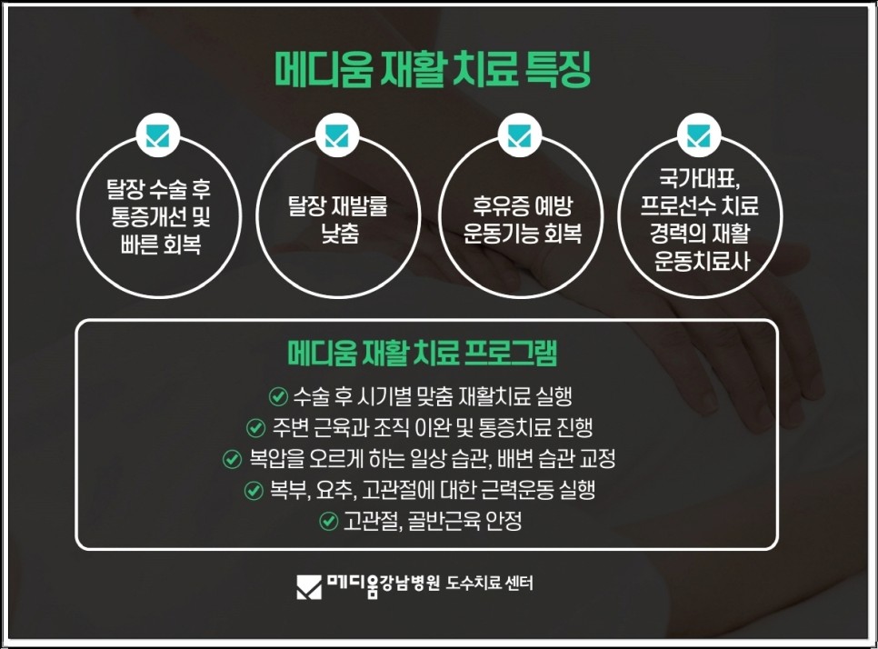 탈장 수술 후 재활, 메디움이 추천받는 이유 메디엄 강남병원 도수치료센터는 탈장 재활 분야에 특화된 장소에서 탈장 수술을 받으신 분들과 재발성 탈장하신 분들도 많이 방문하고 있습니다.