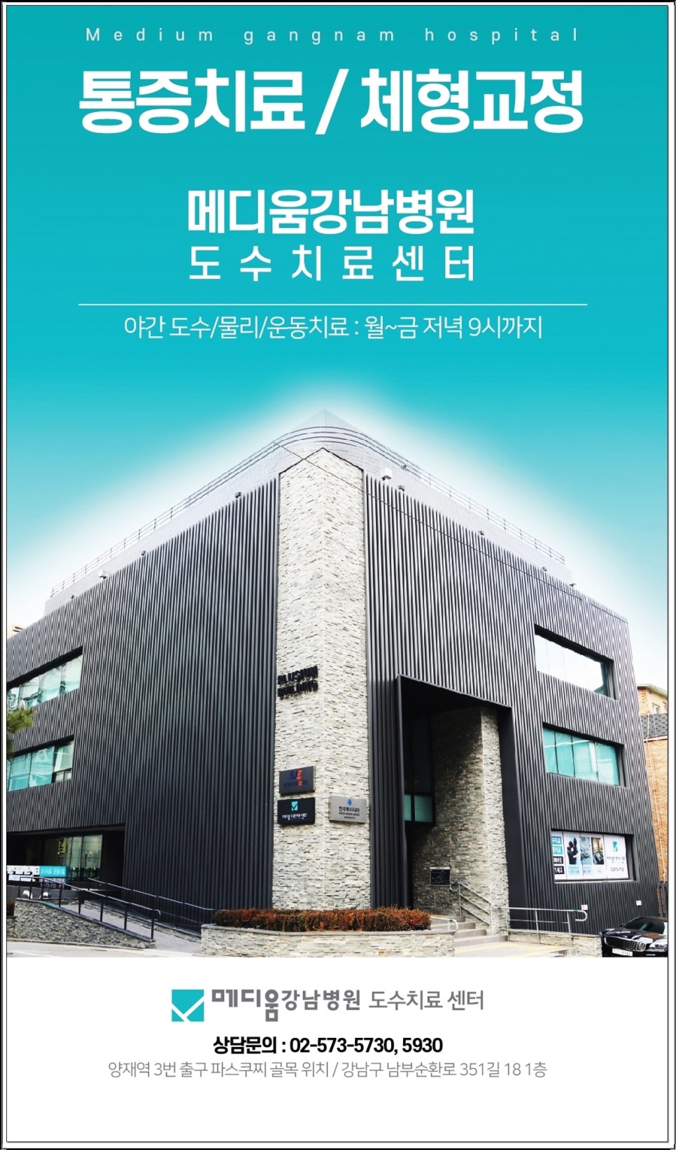 위치는 양재역 3번출구에서 1분거리에 위치하여 대중교통을 이용하시기에 편리합니다.월~금요일까지 오전 10시부터 밤 9시까지 야간진료를 하기 때문에 퇴근 후 방문도 용이합니다.
