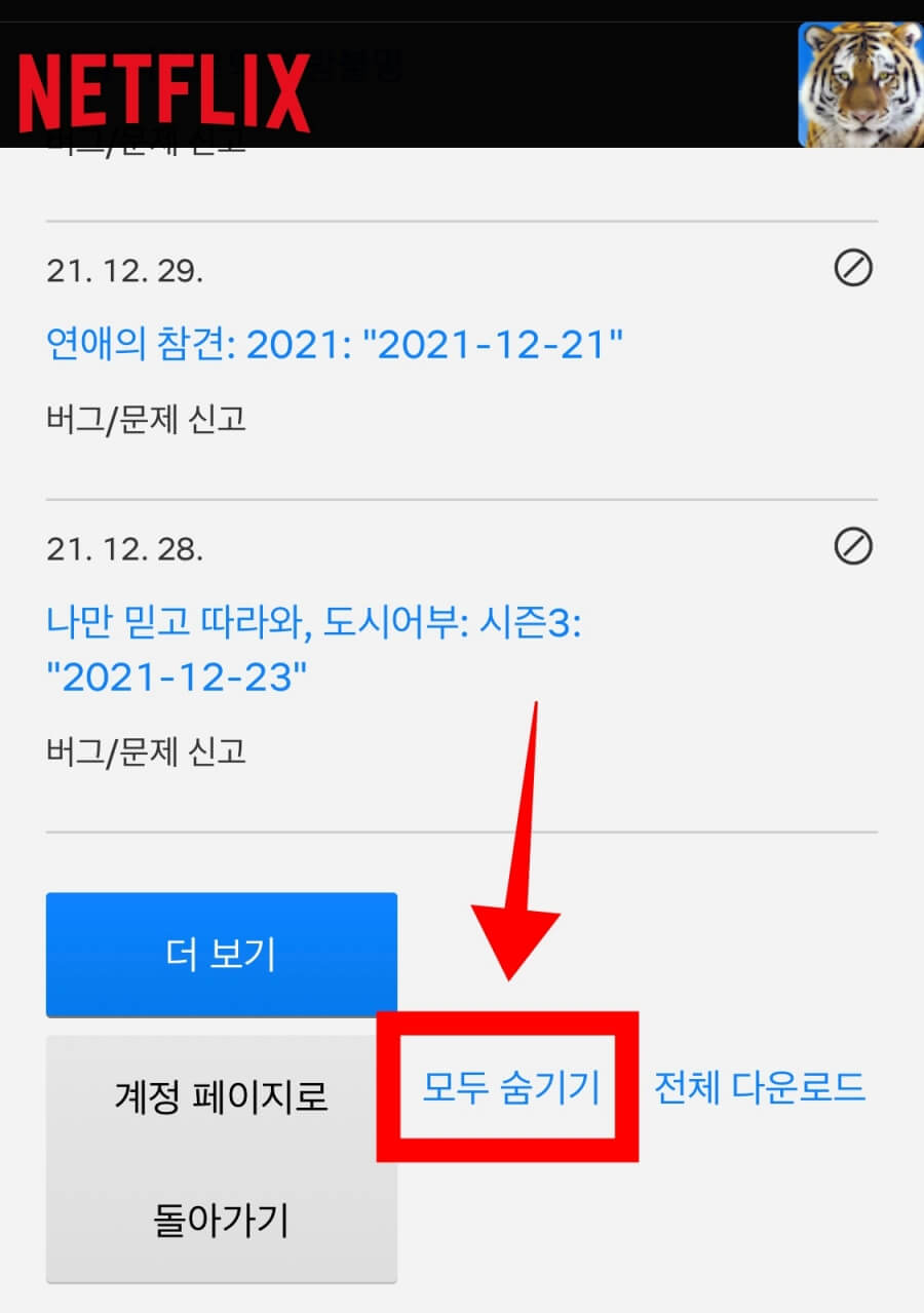 시청기록 화면을 아래로 스크롤하면 모든 목록을 한꺼번에 지울 수 있다고 합니다.더 보기 계정 페이지로 돌아가라는 안내 옆에는 ‘다 숨기기’라는 문구가 함께 보이는데, 여기를 누르면 보이던 전체 넷플릭스 시청기록 삭제가 이뤄진다고 합니다.