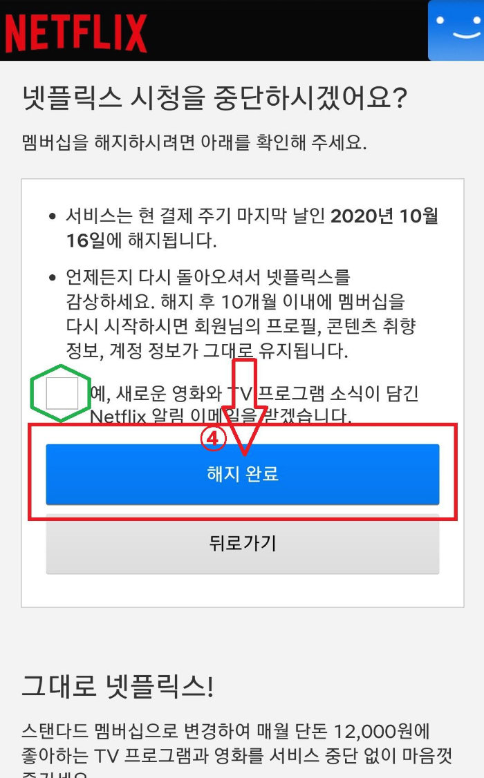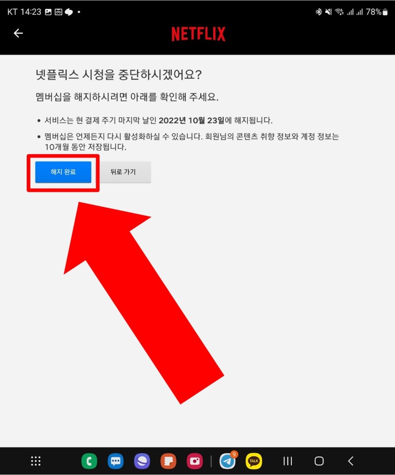 5. 별도 인증 같은 건 없고 중앙에 있는 해지 완료 버튼을 누르기만 하면 넷플릭스 해제 실행이 모두 완료됩니다. 단, 별도의 환불은 없고 결제 주기 마지막 날까지 서비스가 진행됩니다. 다시는 돌아오지 않는다