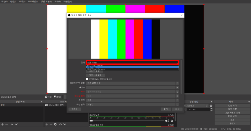 OBS를 처음 실행하면 다음과 같이 빈 화면이 나타납니다.먼저 소스 목록 우클릭 > 추가 > 비디오 캡처 장치를 클릭하여 녹화할 화면을 추가합니다.