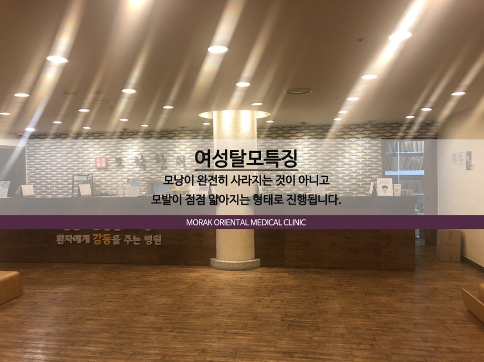 어떤 식으로 진행될까?중년여성의 탈모는 남성과 다른 형태로 이루어질 수 있습니다.남성의 경우 헤어라인이 무너져 자꾸 뒤로 밀리는 M자형이 되는 반면, 여성의 경우 머리 윗부분인 정수리부분과 가르마머리가 얇아지면서 힘을 잃어 시간이 지나면 모공이 비어 트리형태로 두피가 보일 수 있습니다.