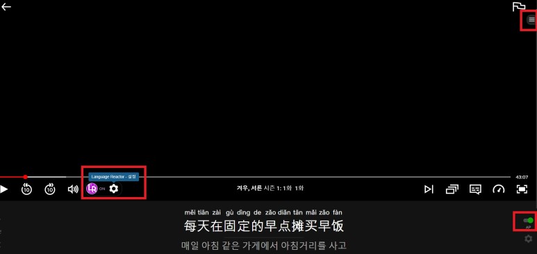 오리지널 트랙 강제 실행 : 활성화-Netflix 오디오 언어 : 중국어(간체)-Netflix 자막 언어 : 중국어(간체)-번역 언어 : 한국어