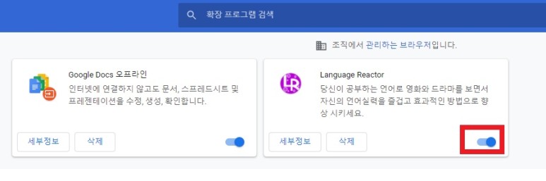 이렇게 확장된 프로그램이 나오는데 ★ 비활성화 되어 있으면 우측으로 드래그를 해서 활성화시킵니다.
