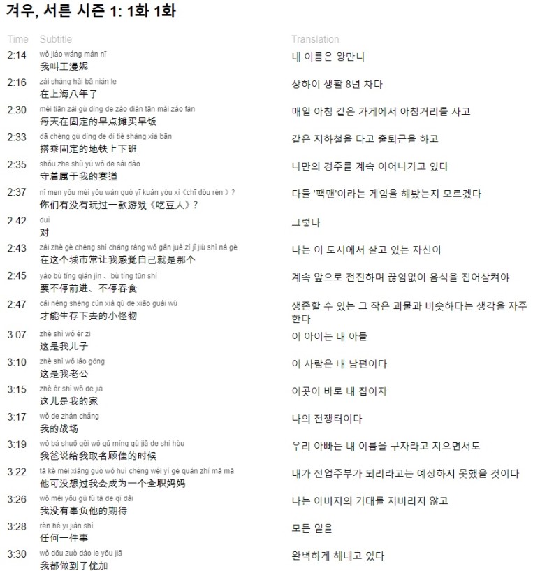저는 이런 식으로 대본을 추출하여 중국어-겨우 30살(30살) 영어-플립(flip)으로 공부하고 있습니다.