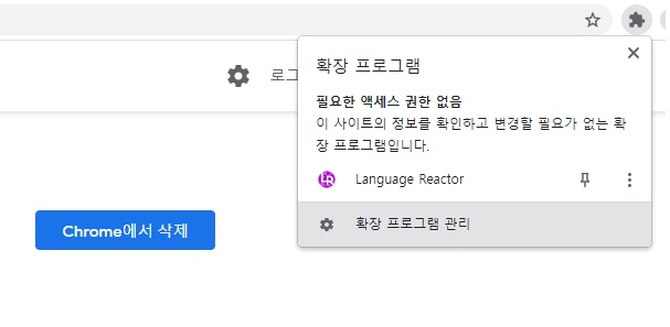 넷플릭스 Language learning 확장프로그램 설치 후 [확장프로그램에 추가] 버튼을 선택합니다.상단의 설정 버튼을 누르면 추가된 것이 보여집니다.