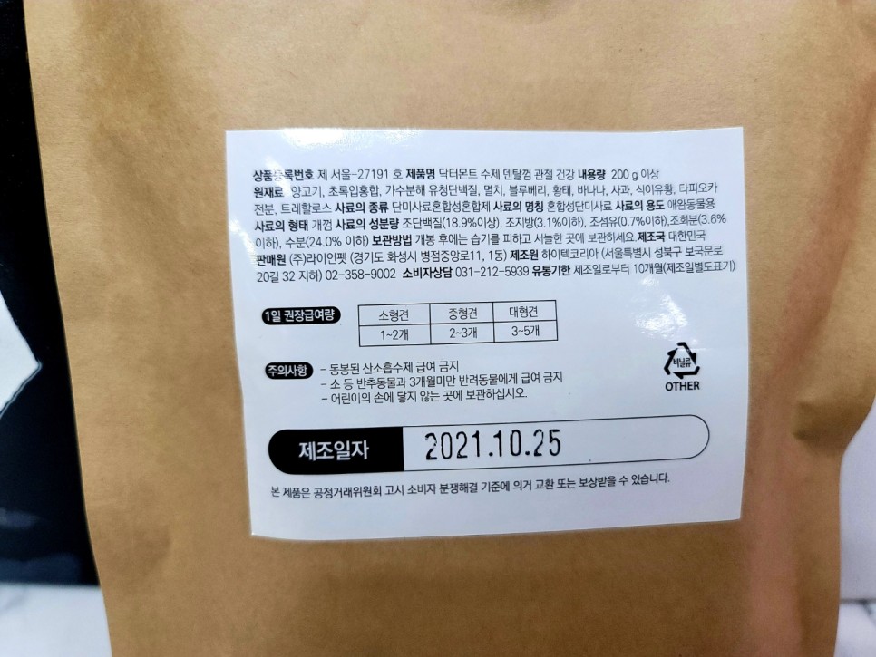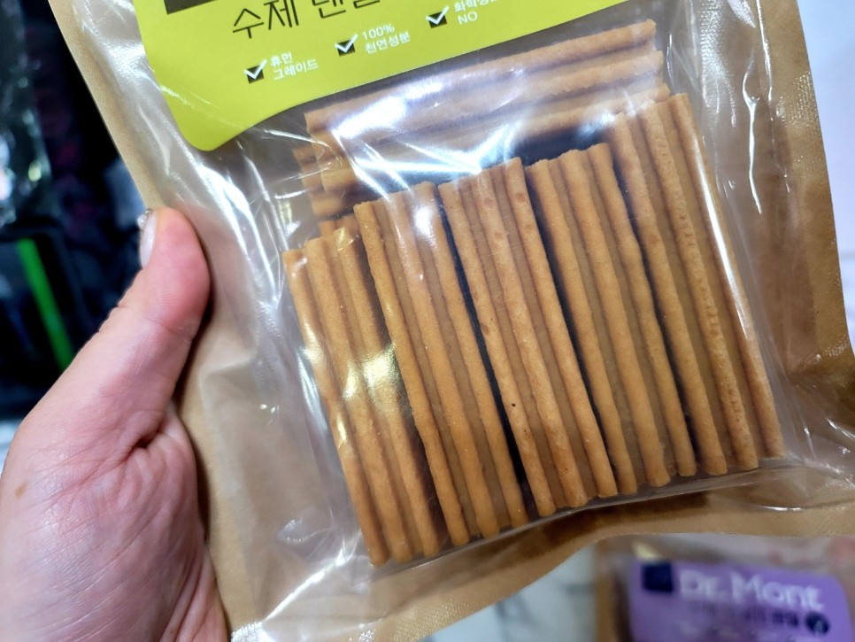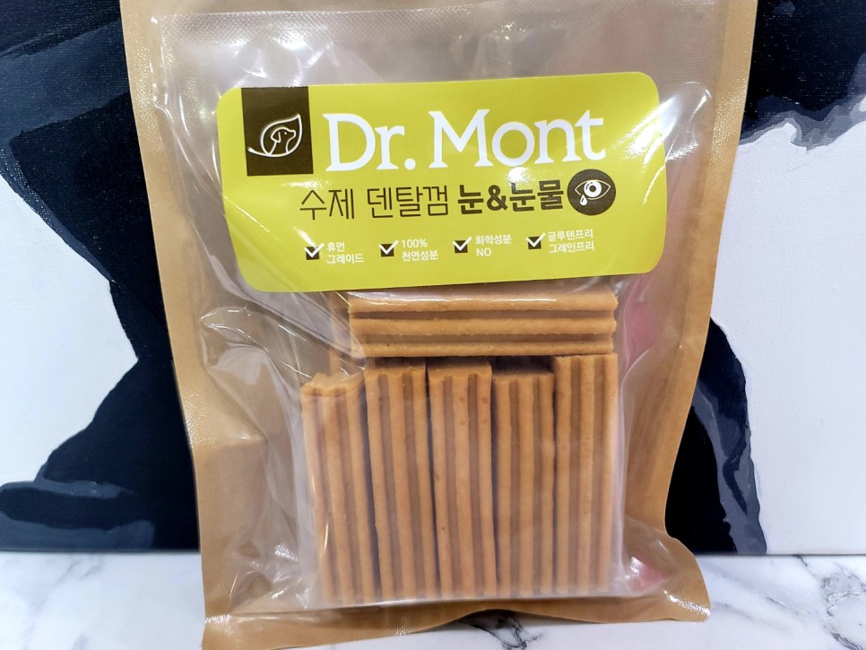 이건 닥터몬트의 눈&눈물에 효과가 있다는 수제 덴탈 껌입니다!노란색입니다. 이건 당근인 줄 알았는데, 진짜 당근 포함! 그리고 일단 눈에 좋다는 작은 칸이 원재료에 있네요!가수분해 성분에는 당연히 연어, 간회, 대구, 당근, 타피오카, 고구마, 토마토, 사과, 치즈 등의 건강한 재료가 포함되어 있습니다.간식봉투는 누가 봐도 수제 간식! 일단 저는 외국제품은 제가 나중에 성분도 확인할 수 없고 그냥 구할 수 없는…. 대부분 손으로 먹이고는 있지만 특히 닥터몬트의 재료 자체가 너무 마음에 들었습니다.