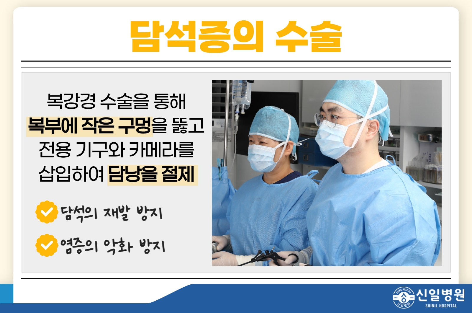 단, 담낭염이 심한 경우 단일통로인 복강경이 오히려 합병증을 늘리는 예외적인 경우도 있으므로 신일병원 외과전문의와 자세한 상담 후 결정하시기 바랍니다.