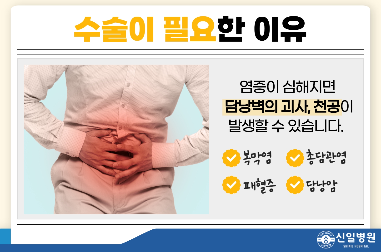 담낭의 통증이나 불쾌감으로 고민이라면 지체 없이 신이치에게 내원해 주시기 바랍니다. 감사합니다서울특별시 강북구 덕릉로 73 신일병원