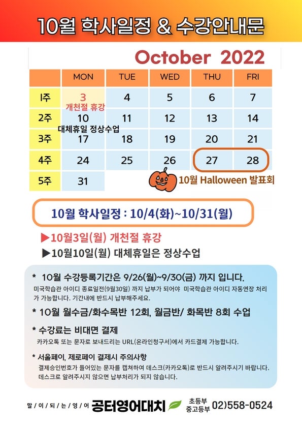 대치동 초중등영어학원-공터영어대치-12월 학사일정&수강등록 안내문 공터영어대치-12월 수강등록기간입니다. **등록기간: 11/25(금)~11/30(수) ▣ 12월 학사일정: 12/1(목)~12/28(수) 학원 겨울방학 휴강: 12/29(목)~12/30(금)은 휴강으로 수업이 없습니다.(수업일수에서 제외) + 방문등록은 평일 오후 1시~8시에 가능합니다.+ 비대면 결제가 가능합니다.(재원생 학부모님은 카카오톡으로 발송) (신규등록을 원하시는 학부모님은 데스크로 연락주시면 비대면 결제창 문자로 보내드립니다.) + 제로페이(서울페이) 결제를 원하시면 데스크로 문의해주시기 바랍니다.(서울페이(제로페이)로 등록하실 경우 교육비는 지불하실 수 있으나 콘텐츠비는 지불하실 수 없습니다.) 데스크로 사전 문의하시면 콘텐츠비 결제창은 별도로 보내드립니다.)