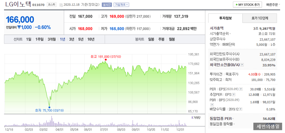 2020년 12월 18일 종가 기준 자율주행주의 대표주 LG이노텍의 주가는 166,000원으로 코스피 시가총액 72위였습니다.
